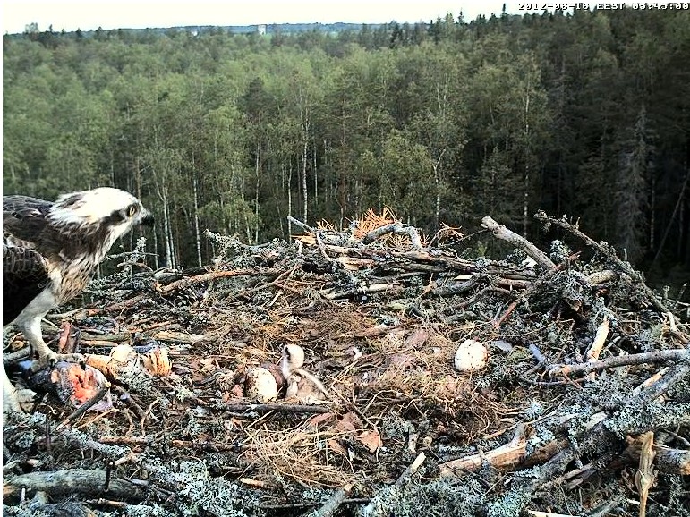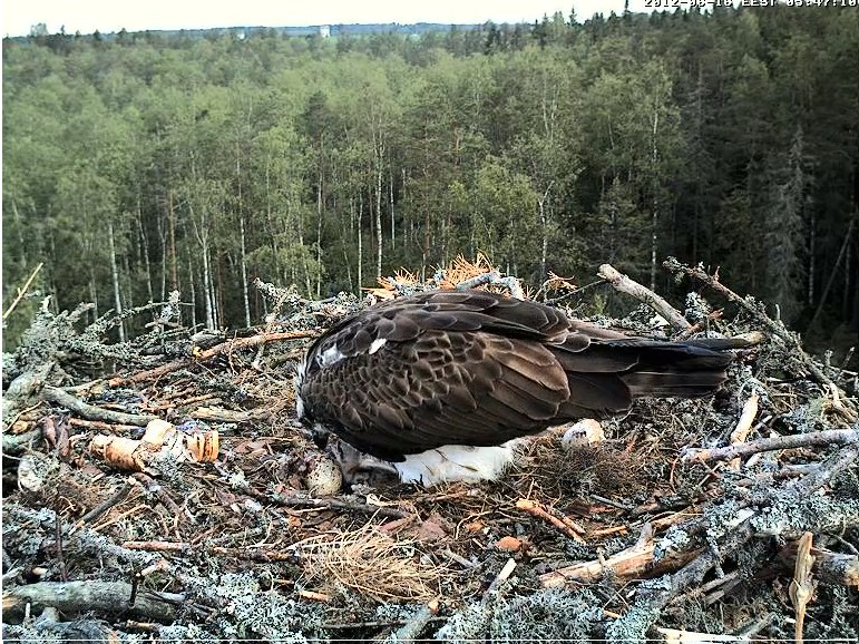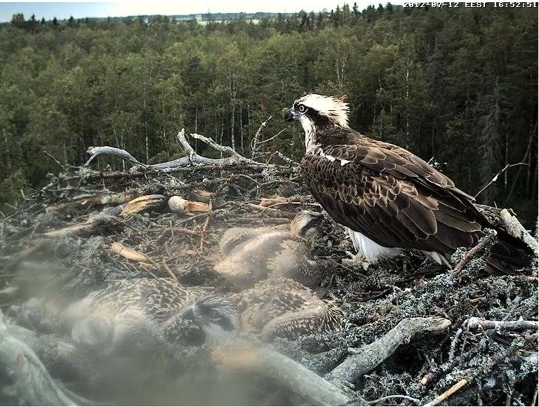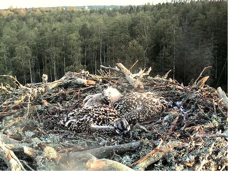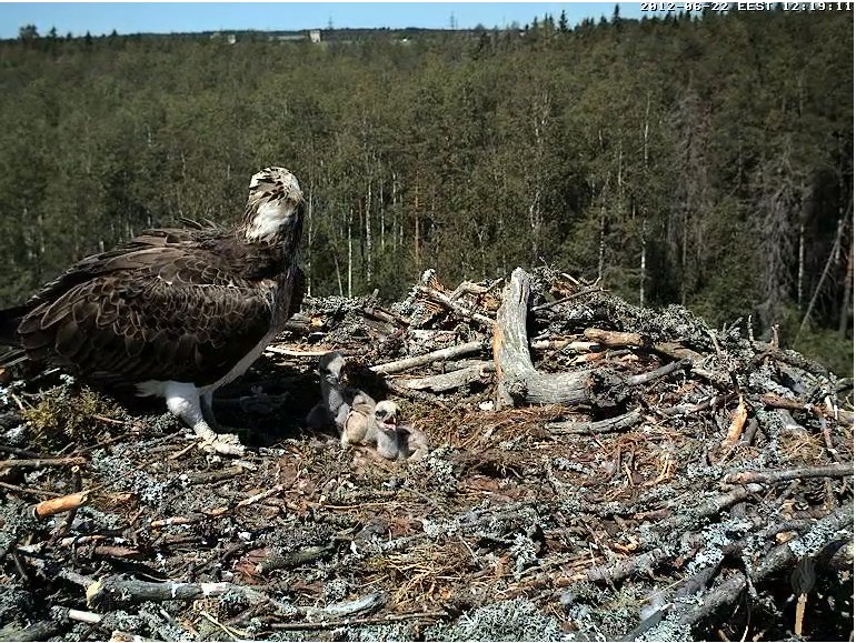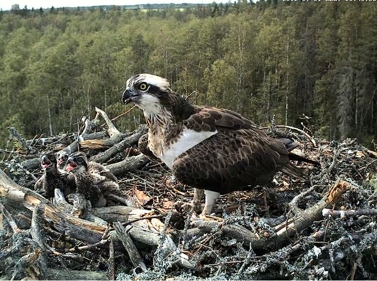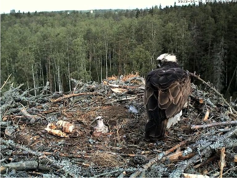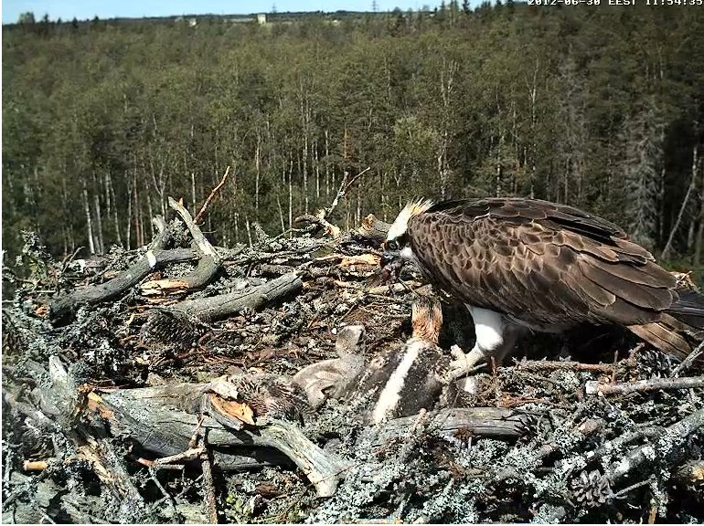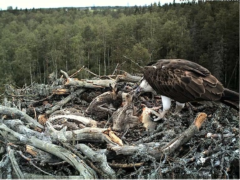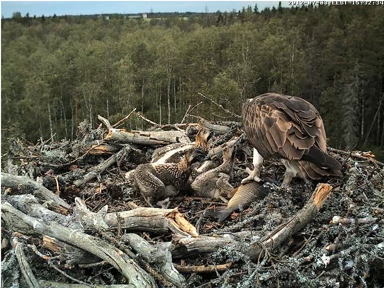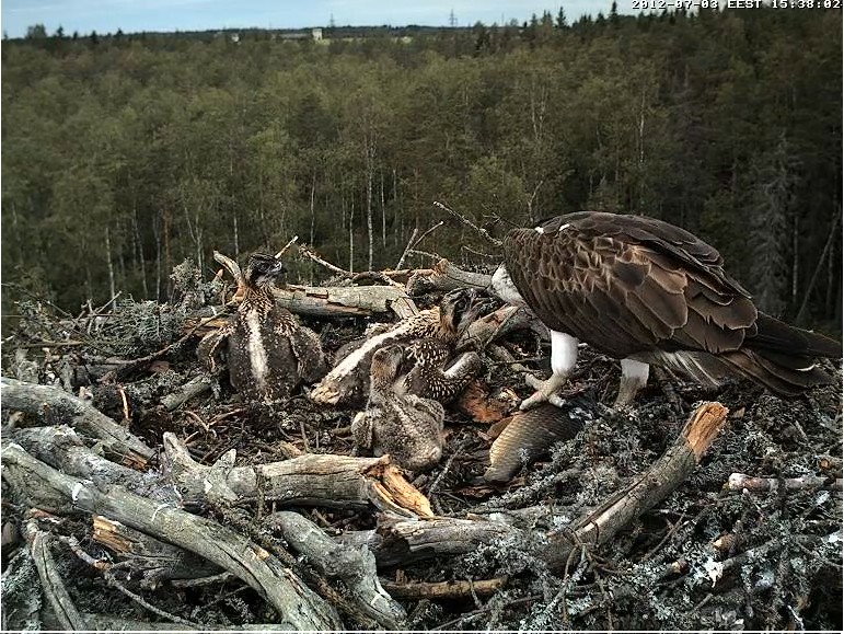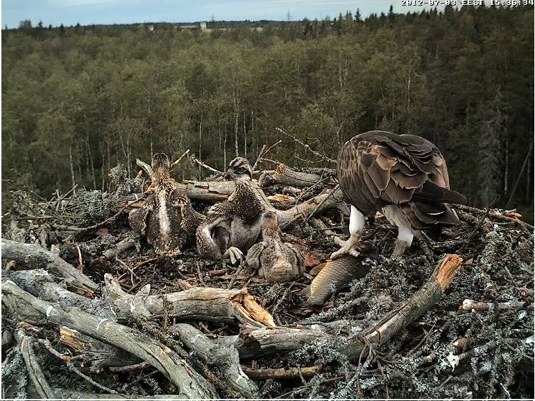 親が食いちぎった魚の肉片を、口移しでヒナに与えます。順番があるようでないような感じで、3羽とも首を伸ばしてねだっていました。